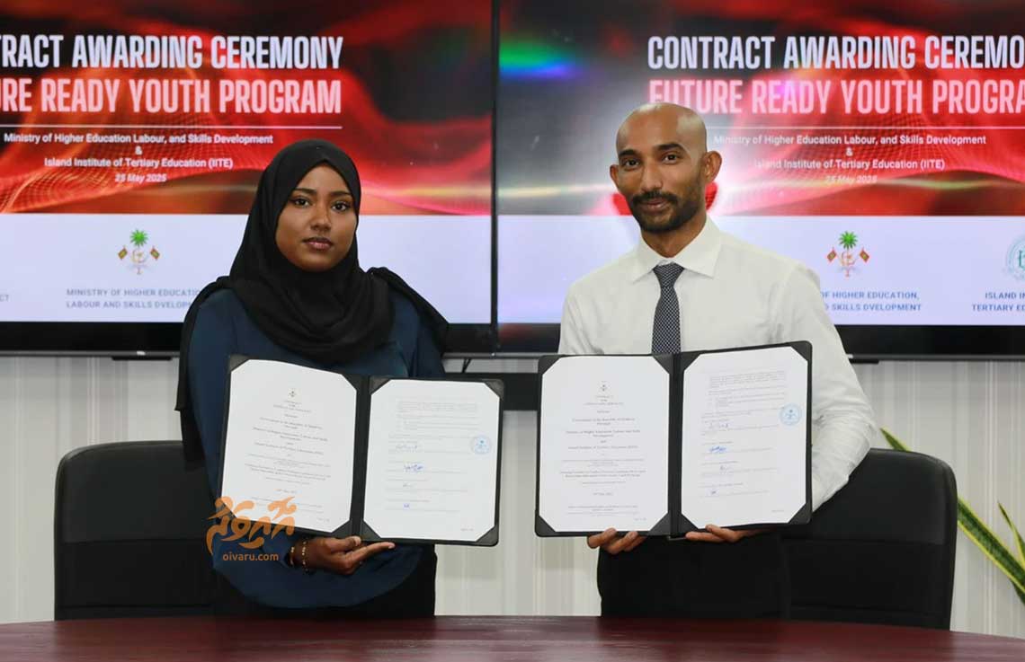 "ފިއުޗަރ ރެޑީ ޔޫތް ޕްރޮގްރާމް"ގެ ދަށުން 600 ޒުވާނުންނަށް ޓިވެޓް ދާއިރާ އިން ތަމްރީނު ފޯރުކޮށްދިނުމަށް ހަޔަރ އެޑިއުކޭޝަން މިނިސްޓްރީން ދެ އިންސްޓިޓިއުޓްއަކާއި އެކު އެއްބަސްވުމެއްގައި ސޮއިކޮށްފިއެވެ.