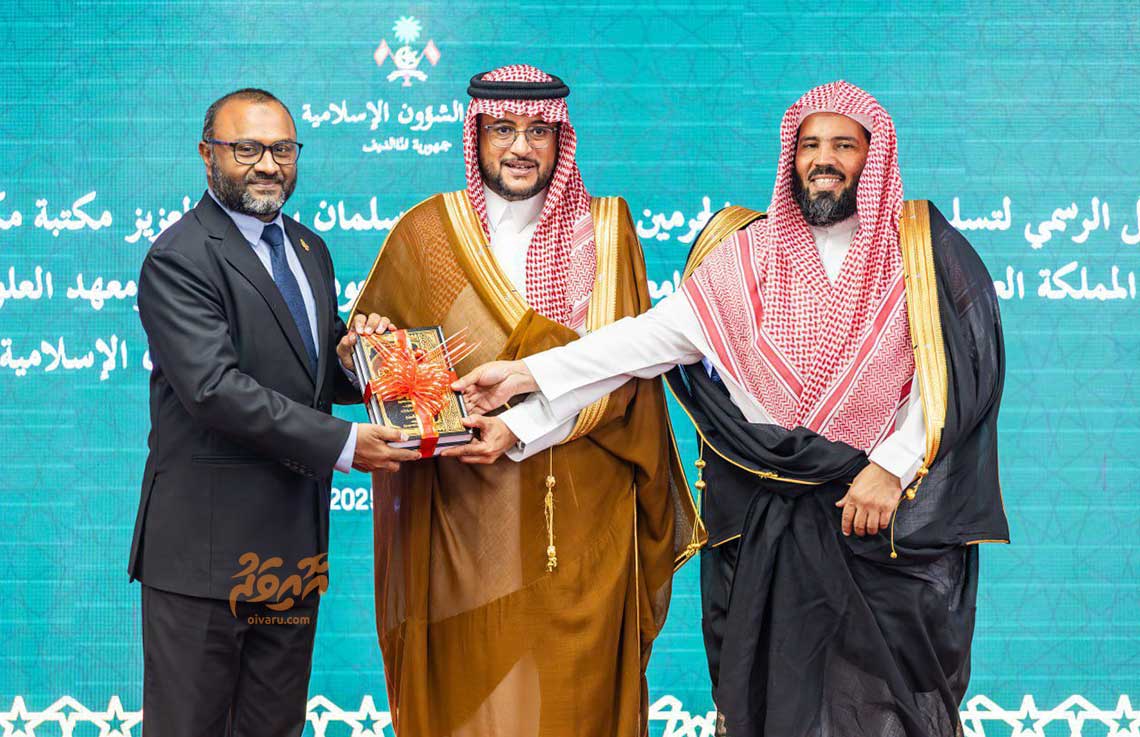 މިކަމަށްޓަކައި މިއަދު އިސްލާމީ މަރުކަޒުގައި ބޭއްވި ހާއްސަ ރަސްމިއްޔާތުގައި އެ ޔުނިވަރސިޓީގެ ފަރާތުން ފޮތްތައް ހަވާލުކޮށްދެއްވީ ރާއްޖެއަށް ކަނޑަޅުއްވާފައި ހުންނަވާ ސަޢުދީ ސަފީރު ހިޒް އެކްސެލަންސީ ޔަޙްޔާ ހަސަން އަލްޤަހްތާނީ އާއި އެ ޔުނިވަރސިޓީގެ ޑިރެކްޓަރ ހިޒް އެކްސެލަންސީ ޑރ. ޞާލިޙް ބިން ސުލައިމާން އަލް ޢަރަޖާއެވެ. މި ފޮތްތަކާ އިސްލާމިކް މިނިސްޓްރީގެ ފަރާތުން ހަވާލުވެލެއްވީ މިނިސްޓަރ ޑރ. މުޙައްމަދު ޝަހީމް އަލީ ސަޢީދުއެވެ.