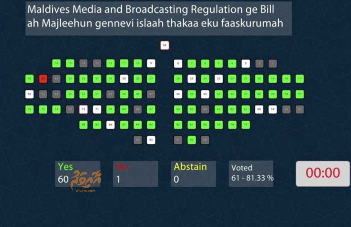60 މެމްބަރުންގެ ވޯޓާއެކު މީޑިއާ ރެގިއުލޭޝަން ބިލް މަޖިލީހުން ފާސްކޮށްފިއެވެ.